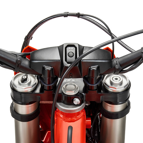 The all-new ZF SHC front fork sees a weight saving of over 250g compared to the previous RR models. The new lighter design uses one spring on the right-side tube that includes preload adjustments, while all of the fork compression and rebound dampening adjustments are handled on the left side. This single spring design is perfect for heavy enduro use and provides the riders with a more planted feel on the track. The new forks also react quicker to the terrain thanks to the reduced friction within the internals of the forks, aiding in rider comfort and on track performance. Complimenting the front fork is the new XTrig FlexFix bar mounts, that reduces vibration and rider fatigue, creating greater on-bike comfort. The rear ZF shock is also new, with updated valve settings that match the new frame and all-new ZF SHC front fork.